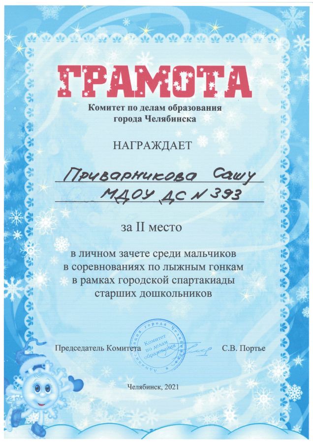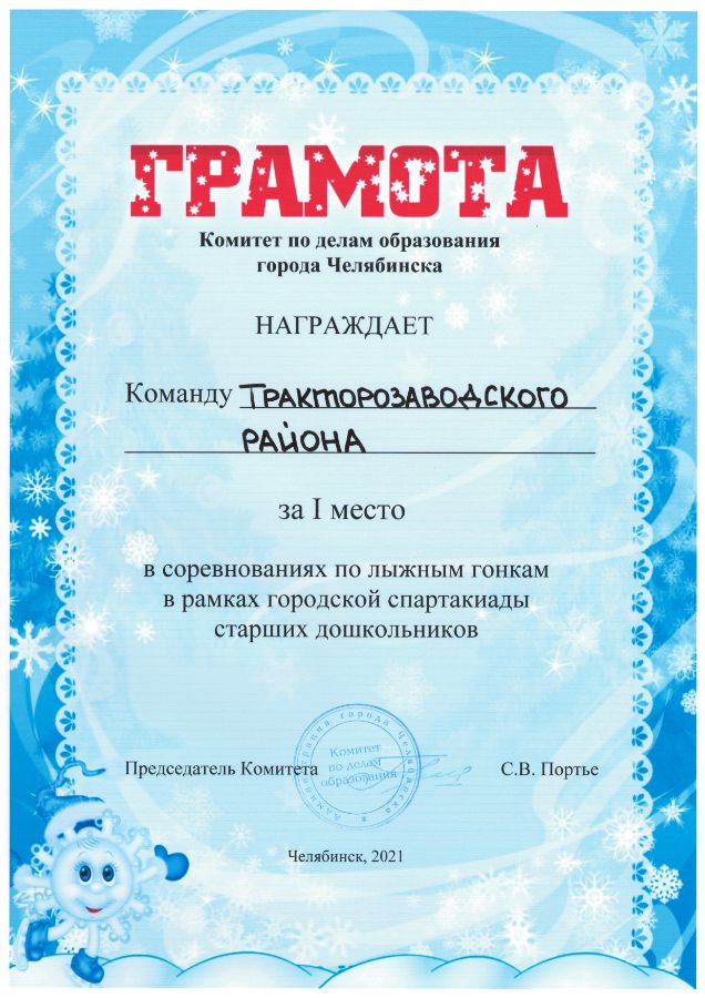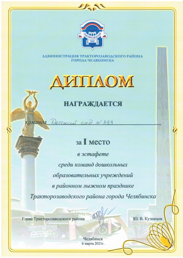 Поздравляю команду Тракторозаводского района, занявшую 1 место в городской лыжной эстафете. В состав команды вошли дети подготовительных групп № 6 и № 9. Они завоевали золотые медали. Приварников Александр занял 2 место в личном первенстве на дистанции 30 метров. Желаю всем здоровья и дальнейших успехов в спорте.