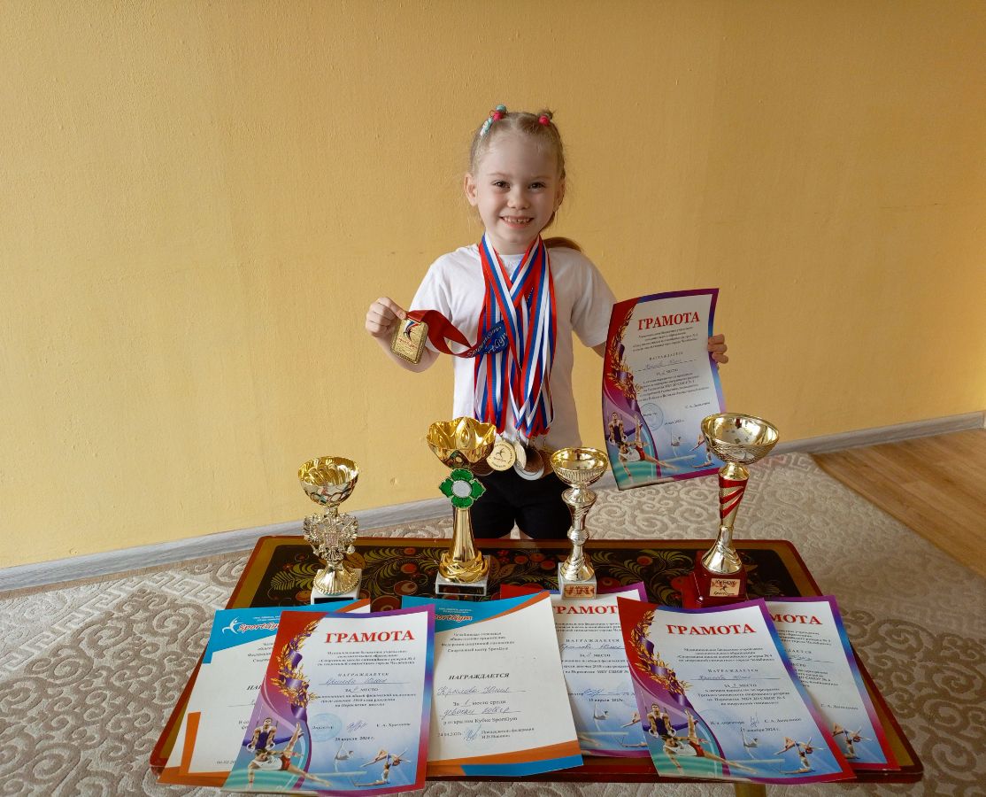 Юлия Крылова -воспитанница подготовительной группы № 8 с 2022 года занимается спортивной гимнастикой и добилась высоких результатов. Многократная победительница и призерка городских соревнований по ОФП и соревнований по спортивной гимнастики в личном первенстве по программе Третьего юношеского разряда. Награждена медалями, кубками и грамотами Челябинской городской общественной организации - Федерация спортивной гимнастики -Спортивный центр Sport Gym и "Спортивной школы олимпийского резерва №4 по спортивной гимнастике" города Челябинска (директор С.А. Даниленко). Гордимся Юлией и желаем дальнейших спортивных побед!